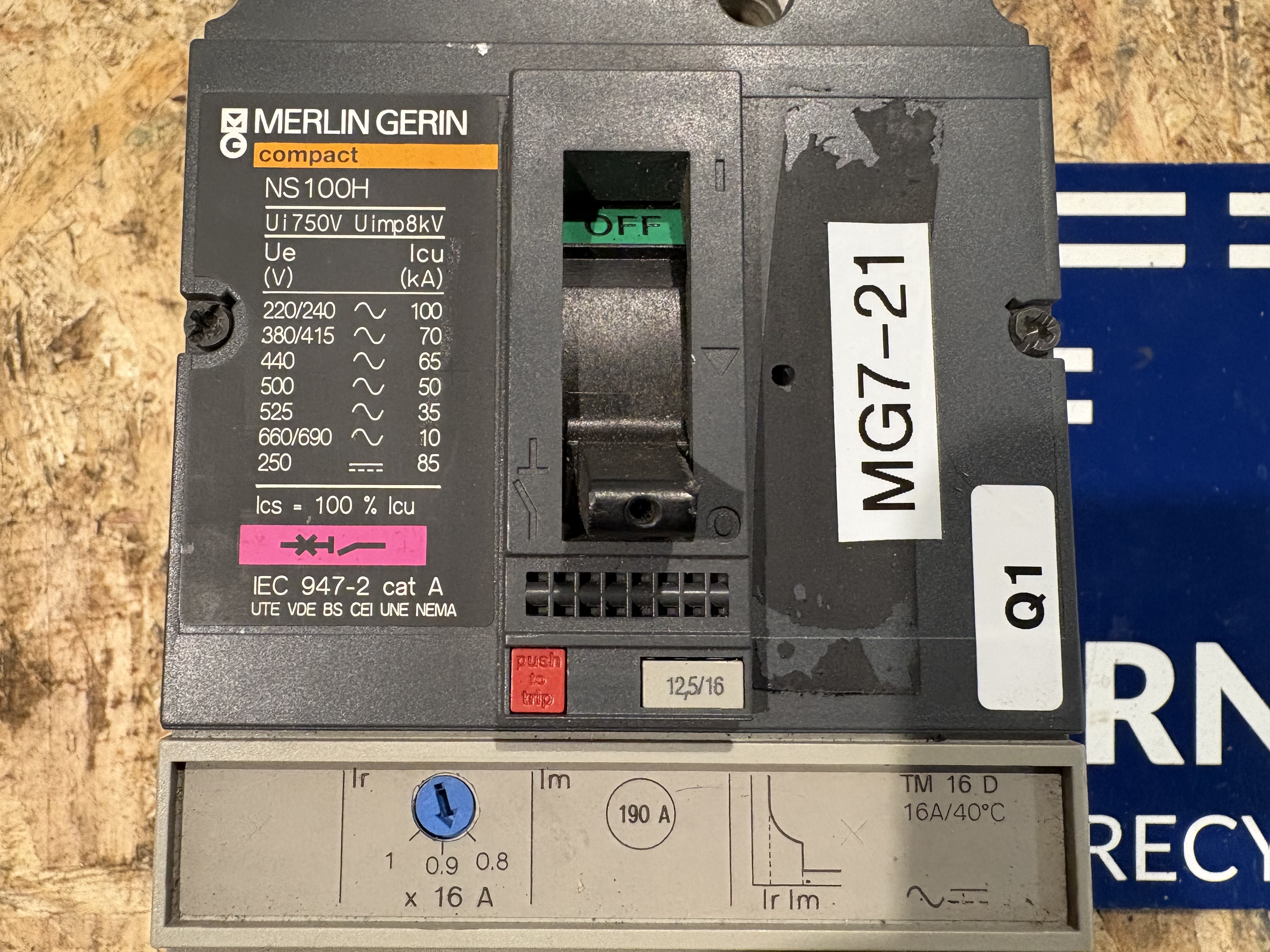 - Remark Merlin Gerin Compact . NS100H. TM16D . UIN 750V . 50/60 HZ . UIMP : 8 KV .