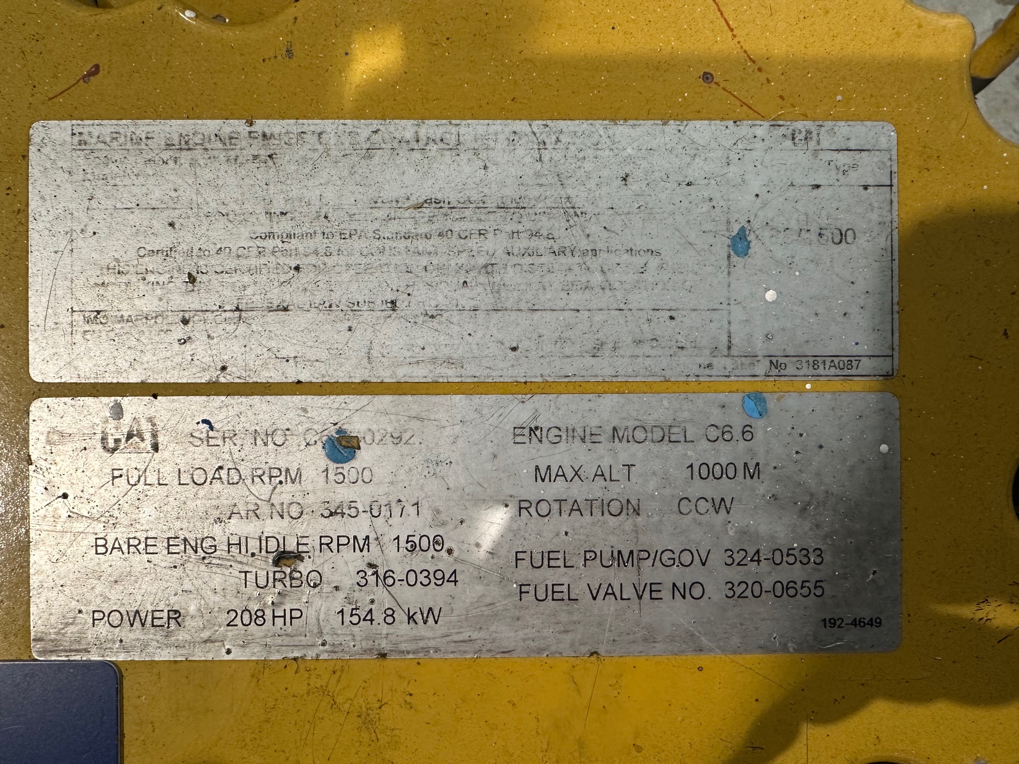 - Remarks Caterpillar C6.6ACRET, 208 HP, at 1500 RPM, Rotation CCW