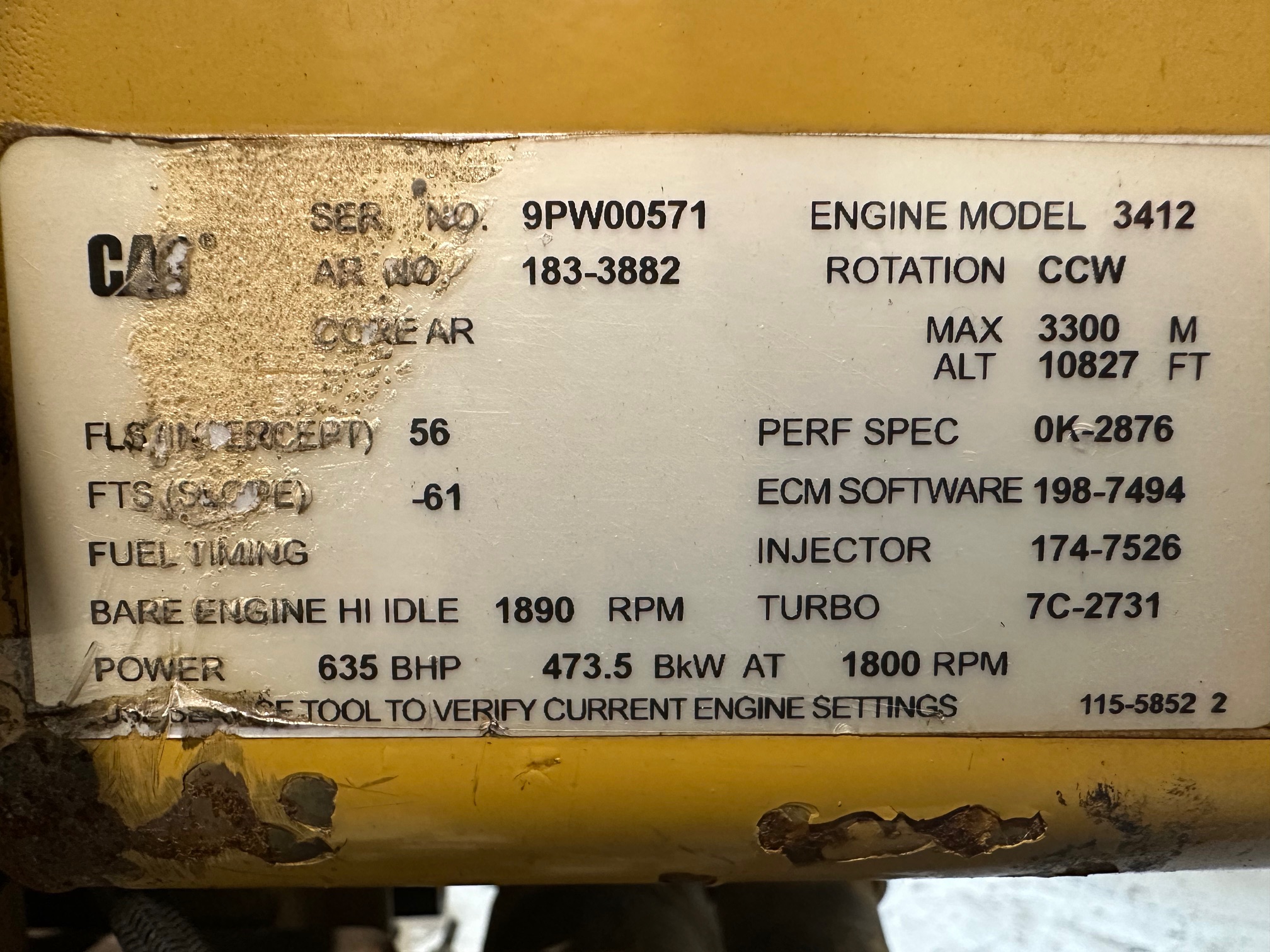 - Remarks Running hours, 37939, Caterpillar 3412, Ser no. 9PW00571, Ar no. 183-3885. Rotation CCW, Perf spec: 0K2876, ECM Software: 198-7494, Injector: 174-7526, Turbo: 7C-2731