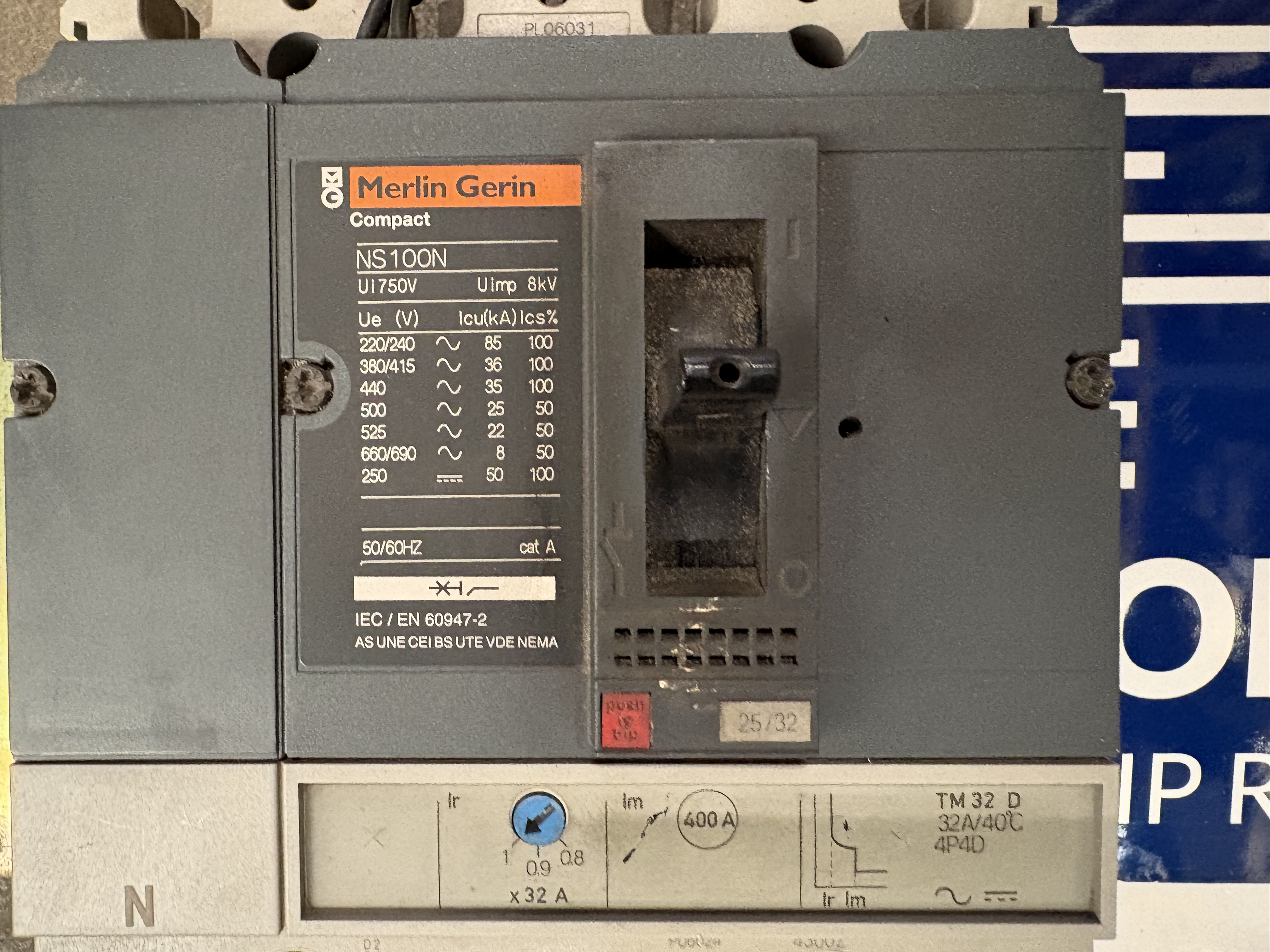 - Remark Merlin Gerin Compact . NS100N . TM 32D . UIN 750V . 50/60 HZ . UIMP : 8 KV .