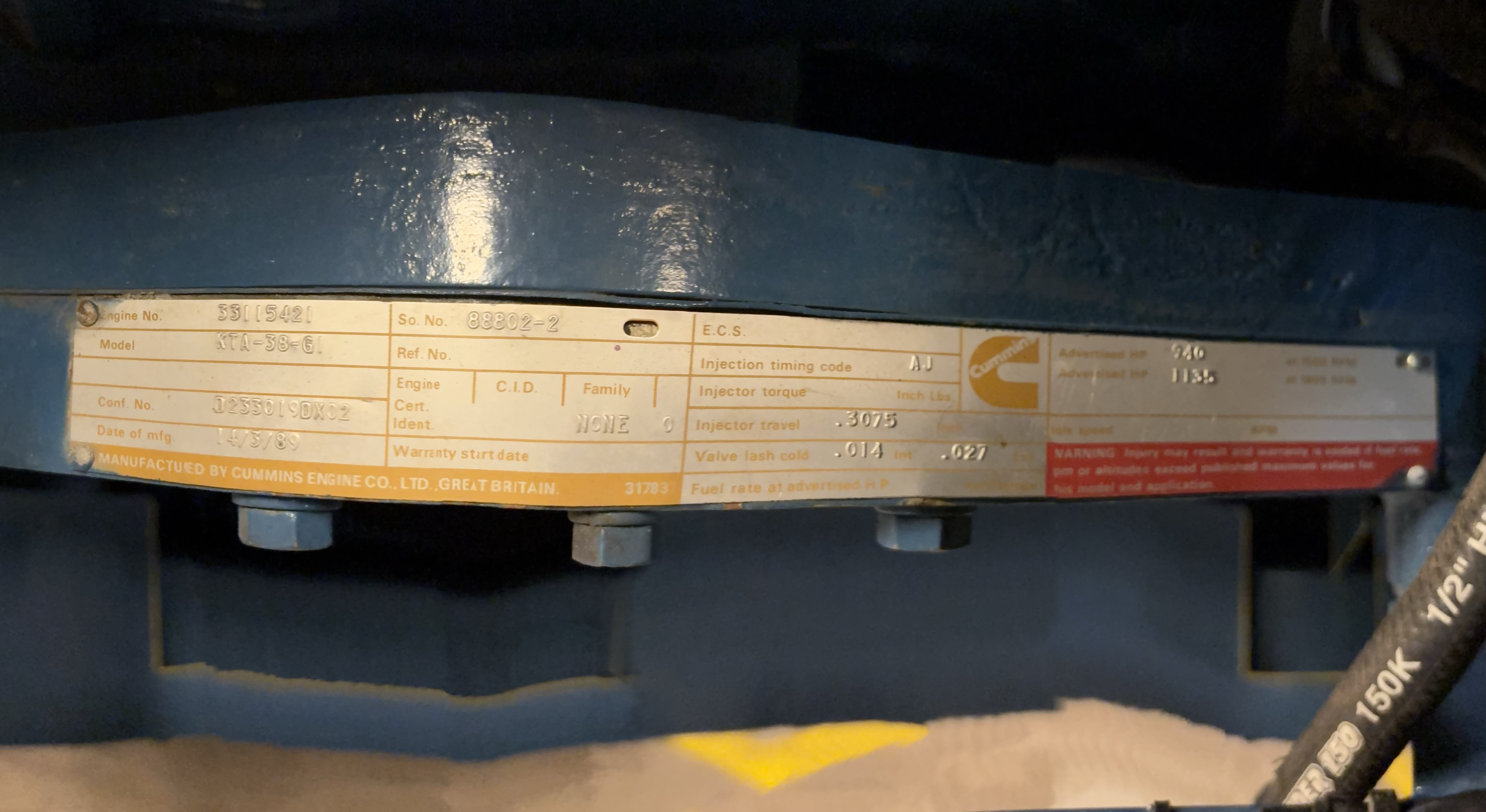 - Engine Cummins KTA38 G1, 940 HP @ 1500 RPM, , year 1989