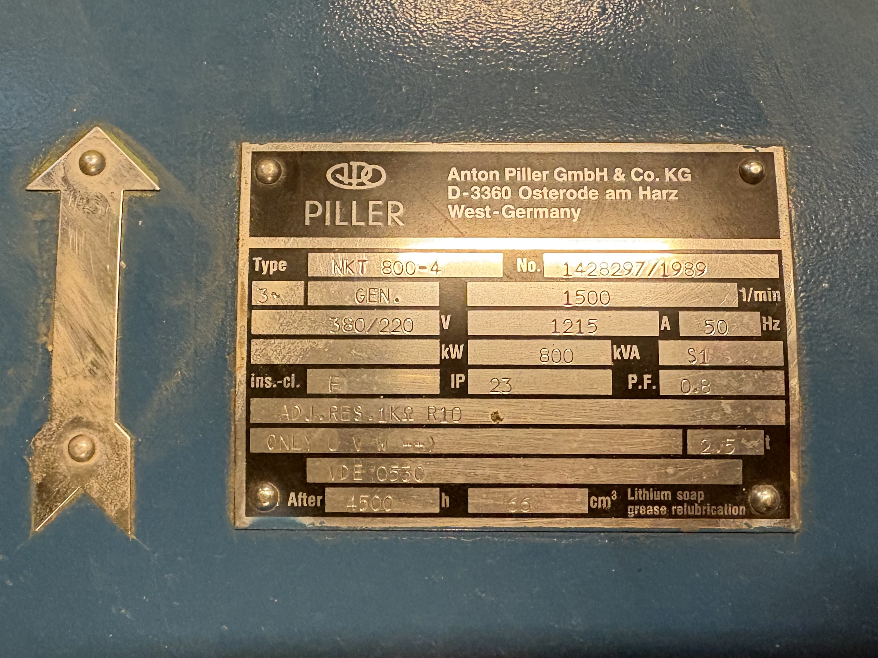 - Generator Piller NKT 800-4, 800 KVA, 380 (400) V, 1215 A, 1500 RPM, 50 Hz